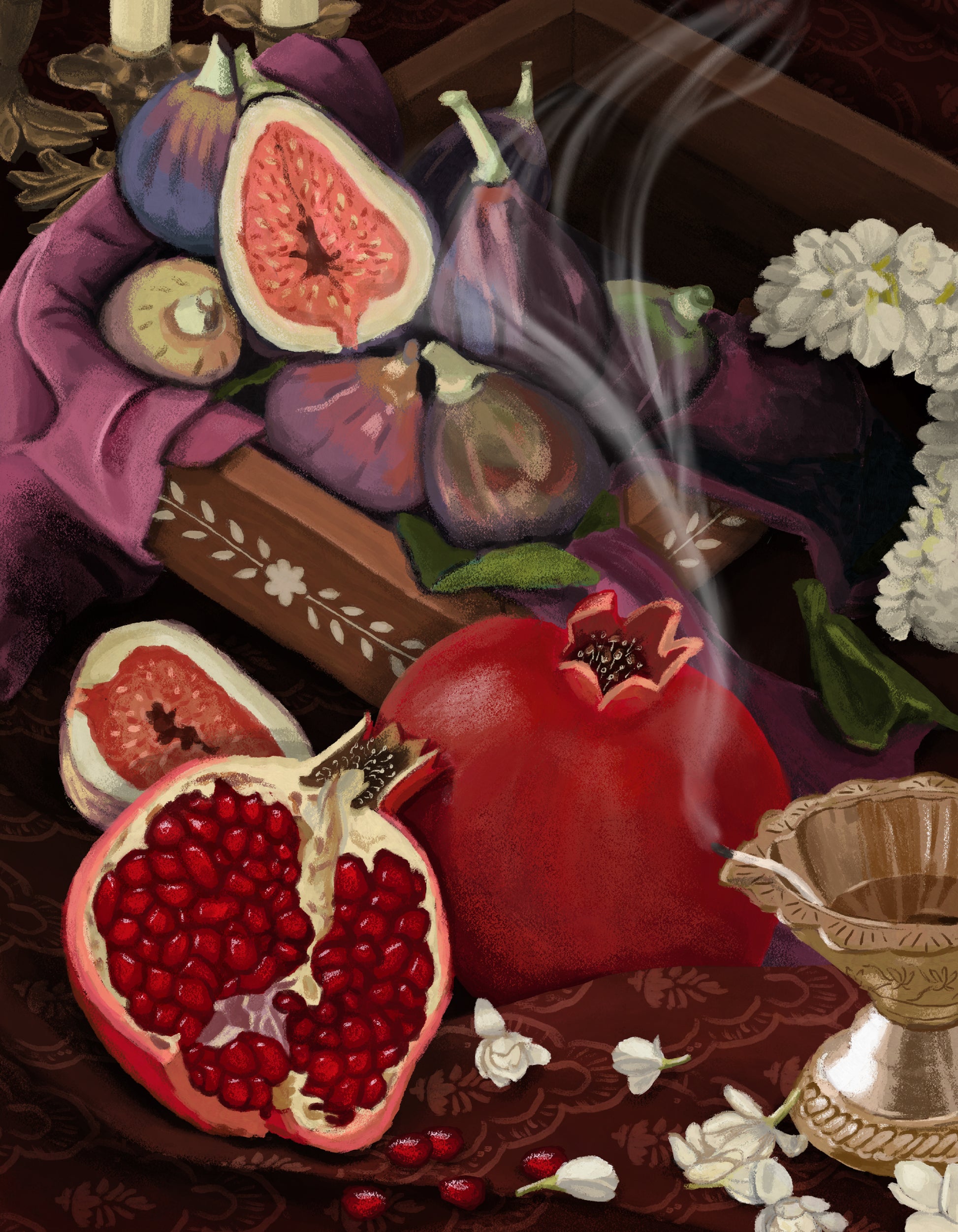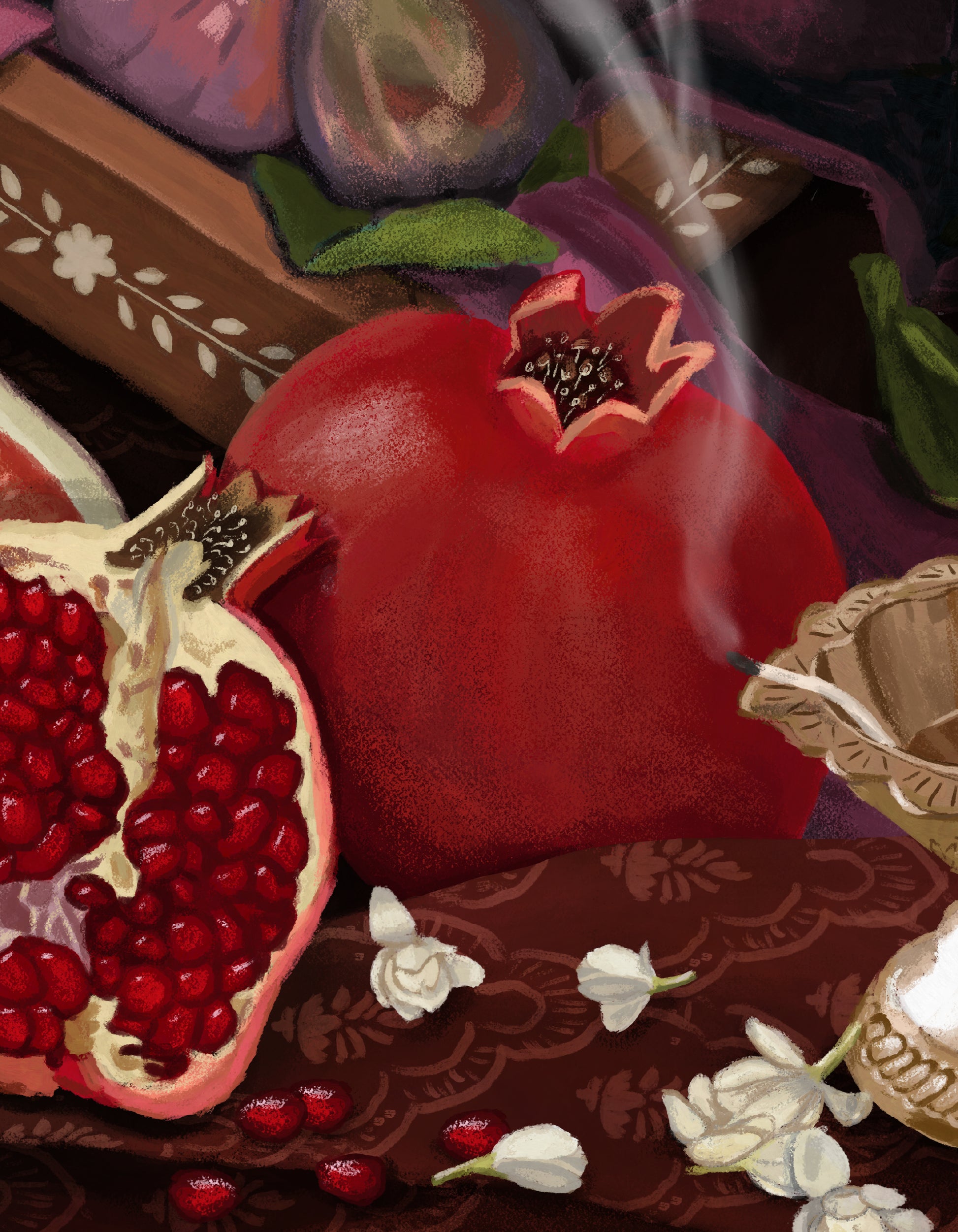 I’ve always been fascinated by figs and pomegranates — their interiors glistening like gemstones, as if they were never just fruit, but treasures waiting to be unveiled. Like heirlooms, they carry history within them.